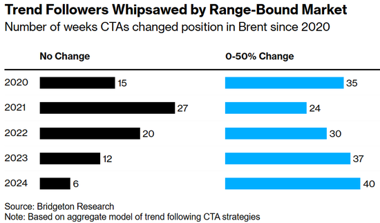 分析师说,往常两年中东地缘政事垂死形势加重导致价钱剧烈波动,亦然导致CTA回撤的原因之一。因此,凭据布里奇顿的数据,在2024年里(除六周外),CTA每周齐在改换其布伦特原油的持仓量。保管持仓量不变的技术惟有六周,这是自疫情爆发前以来最少的。
