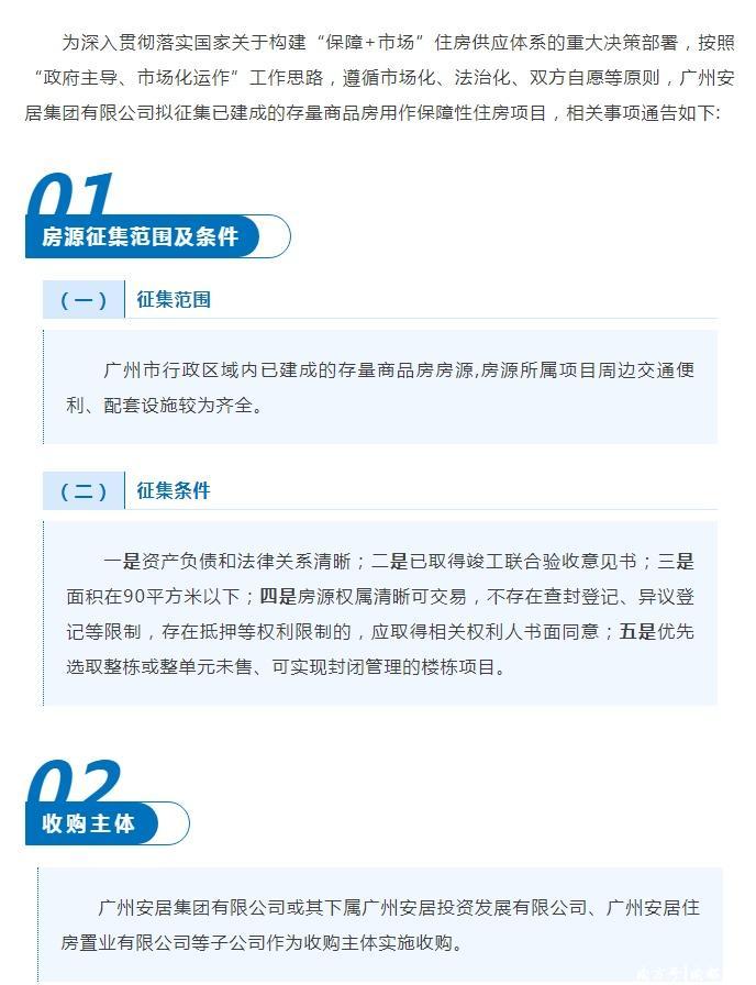 11月18日,广州安堵集团发布《对于收购已建成存量商品房用作保险性住房的搜集通告》,向全市搜集收购已建成的存量商品房用作保险房,要求面积在90普通米以下。