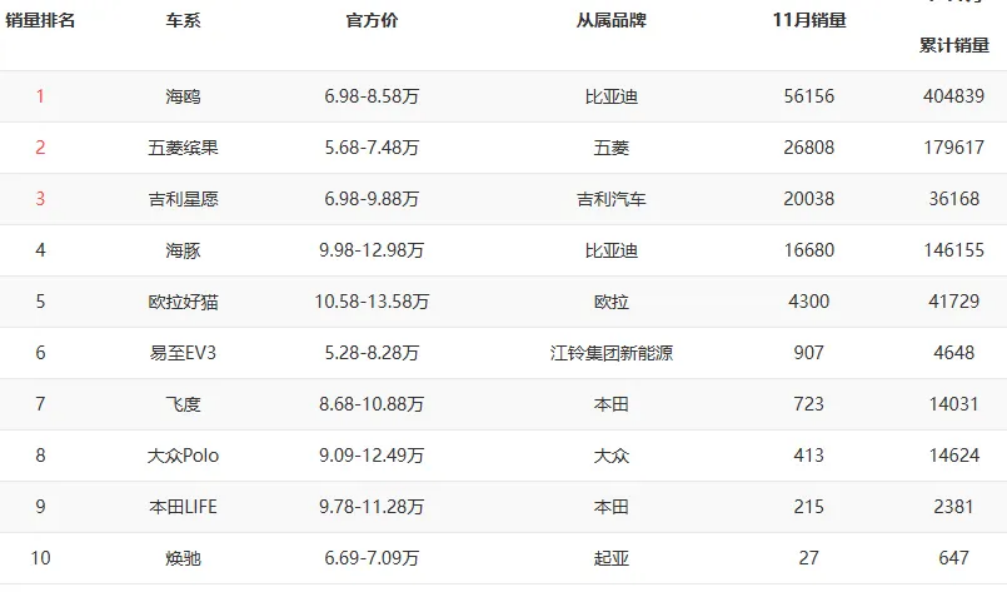 有媒体统计过11月小车型的销量榜单,10万以上的微型车销量要远远低于10万以下的,况兼差距是断崖式的。
