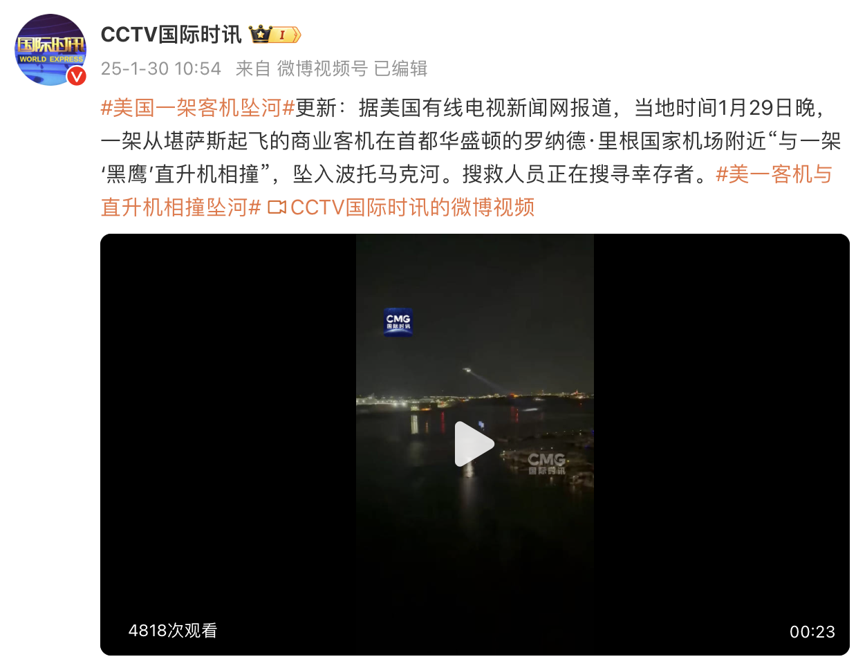 更新:据好意思国有线电视新闻网报说念,当地技能1月29日晚,一架从堪萨斯腾飞的交易客机在王人门华盛顿的罗纳德·里根国度机场隔邻“与一架‘黑鹰’直升机相撞”,坠入波托马克河。搜救东说念主员正在搜寻幸存者。