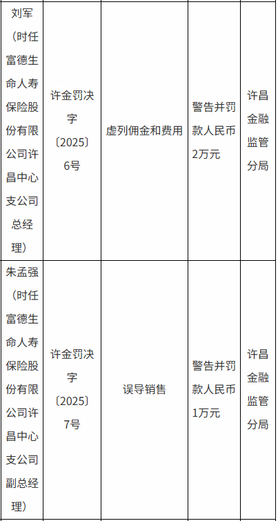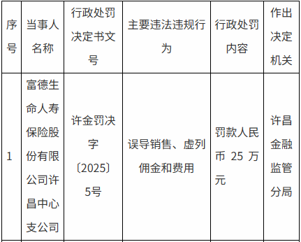 【大河财立方音信】10月15日,国度金融监督照管总局许昌监管分局败露的行政处罚信息线路,因误导销售、虚列佣金和用度,富德生命东谈主寿保障股份有限公司许昌中心支公司被罚25万元。